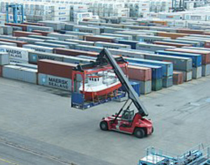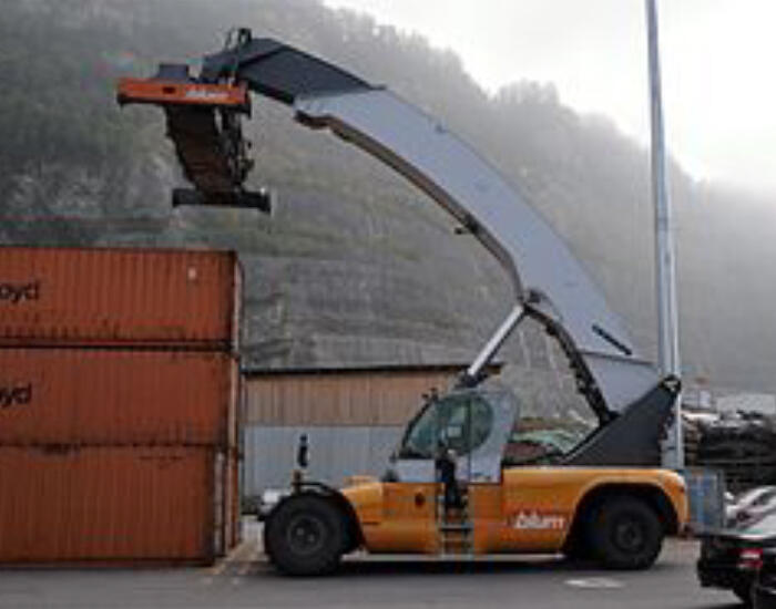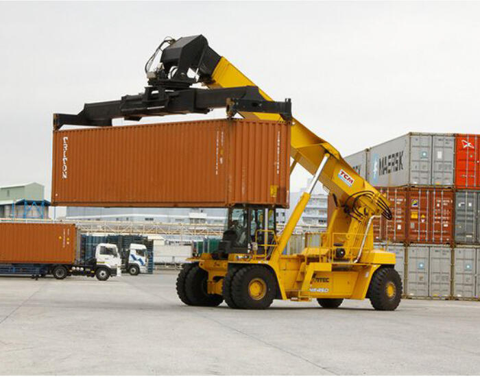 リーチスタッカーは、コンテナを吊り上げて移動または積上げしたり、シャーシに積み卸しする荷役機械(特殊自動車)である。