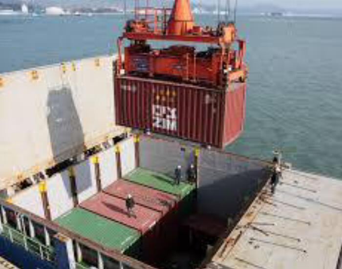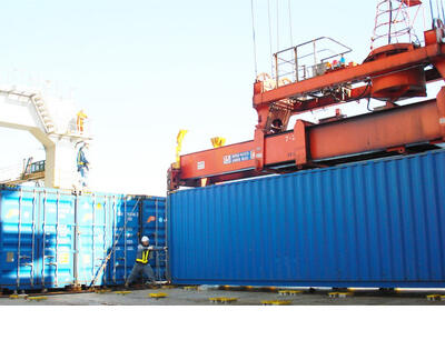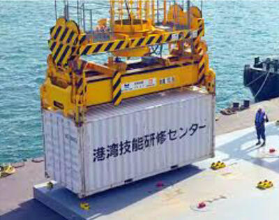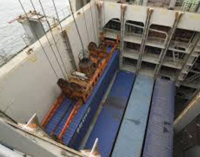 - ポンツーン型ハッチカバー(長方形の蓋状で、本船荷役時はガントリークレーンで取り外して陸側ターミナルのエプロンに置く)上へのコンテナ積み付け。コンテナ船は水密性の高いポンツーン型が多い。